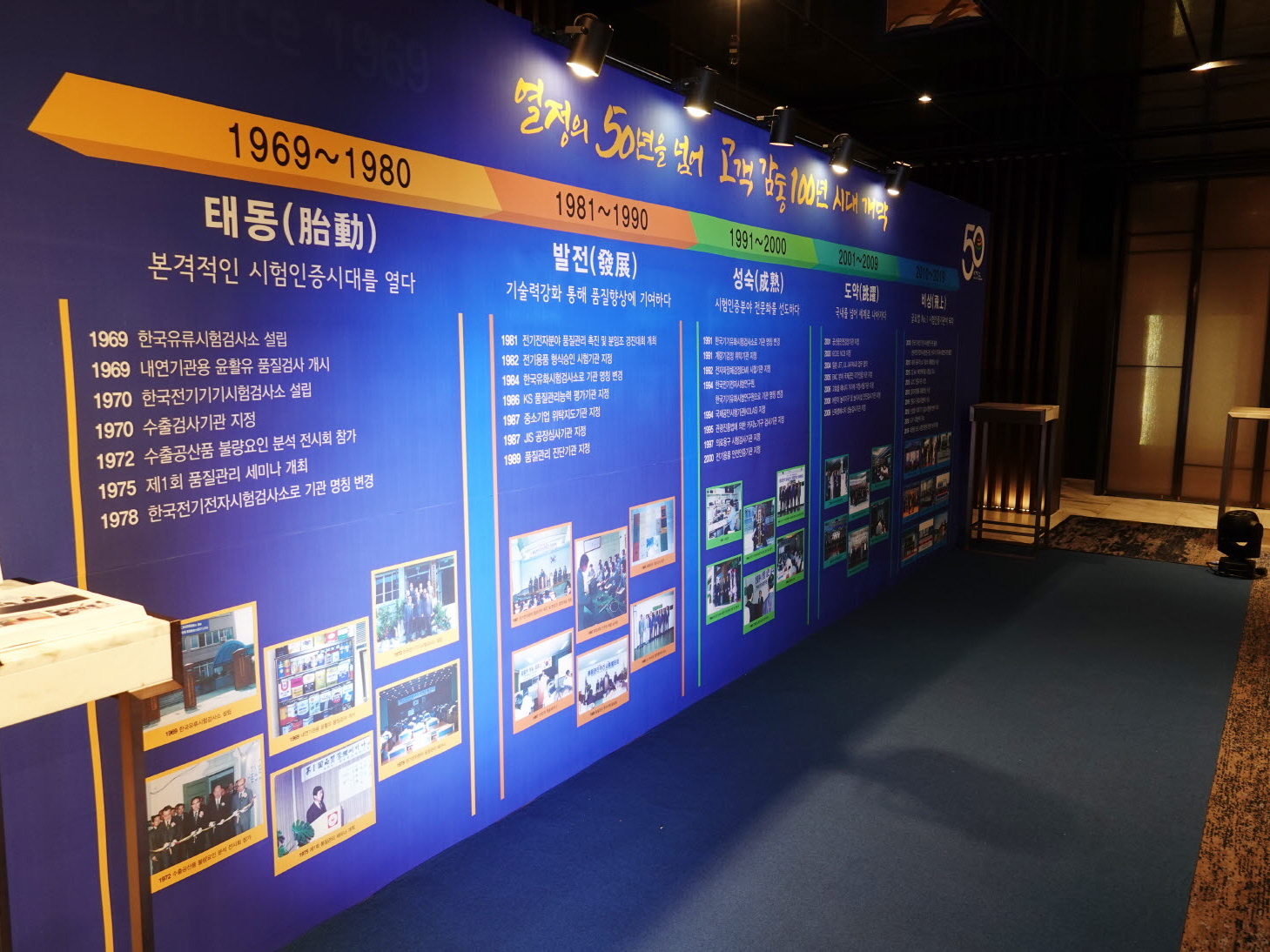 그리고 2019년 7월 1일 서울 JW 메리어트 호텔에서 많은 국내외 인사들이 참석한 가운데 KTC 창립 50주년 기념식이 개최되었습니다. 로비에는 50년의 역사를 한눈에 살펴볼 수 있는 아트월과 다니기획에서 제작한 <한국기계전기전자시험연구원 50년사>를 함께 전시하여 창립 기념식의 의미를 더했습니다.