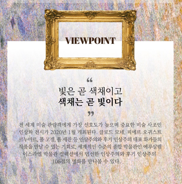 이번 ‘모네에서 세잔까지 : 예루살렘 이스라엘 박물관 인상파와 후기 인상파 걸작전’은 전시와 문화 예술의 향유 확대를 위해 한국인의 선호도가 가장 높은 106점의 명화를 엄선하여 기획된 프로그램입니다. 인상파 창시자 클로드 모네의 수작 수련 연못(1907)을 비롯한 이번 전시를 통해 바쁘게 살아가고 있는 일상 속에 달콤한 휴식과도 같은 행복을 느낄 수 있었습니다.
