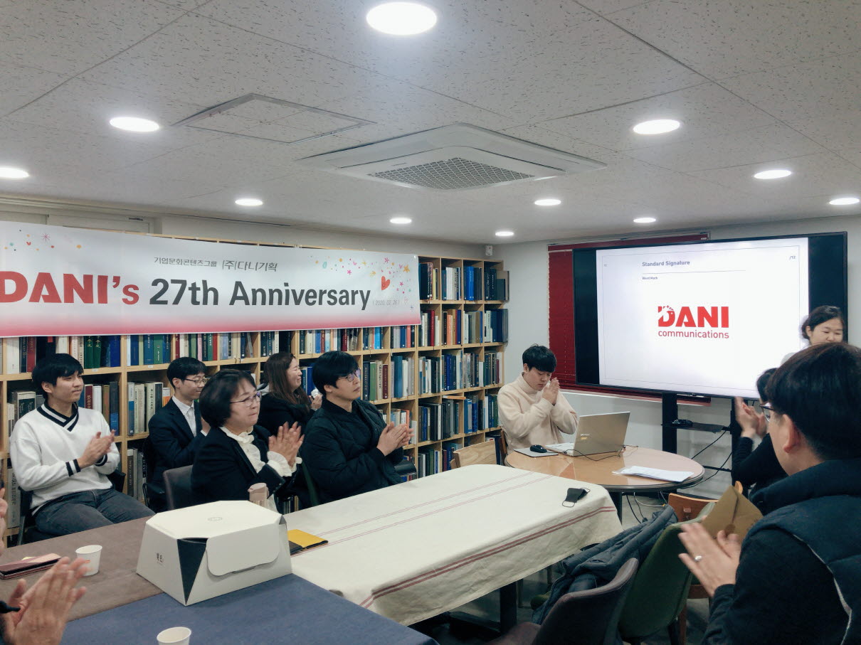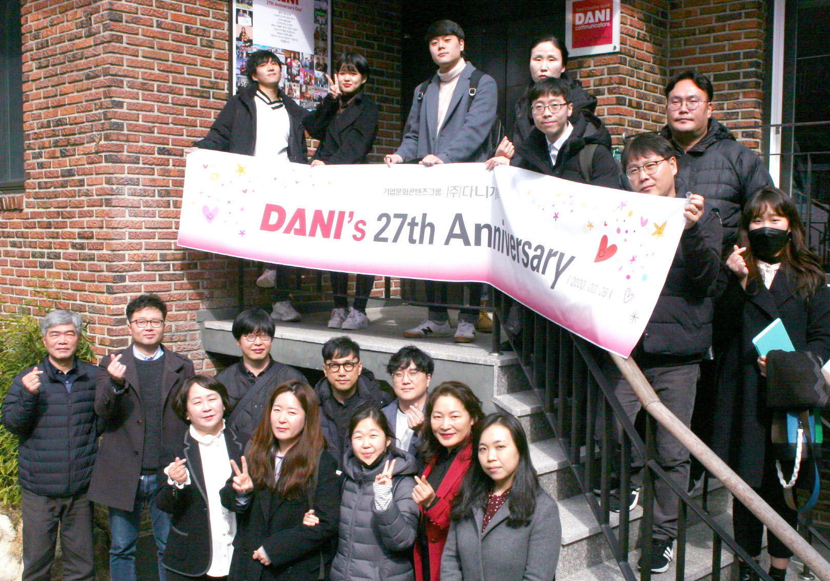 기업문화콘텐츠그룹 ㈜다니기획 (대표이사 추기숙)은 지난 2월 26일 창립 27주년을 맞아 뜻깊은 하루를 보냈습니다. 매년 창립기념일마다 전 구성원이 함께 자축행사를 진행해 온 다니기획은 2020년, 신사옥에서 맞이하는 두 번째 창립기념식이자 논현동시대 1주년을 기념하여 조금 특별한 시간을 준비했습니다.