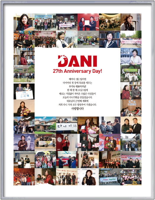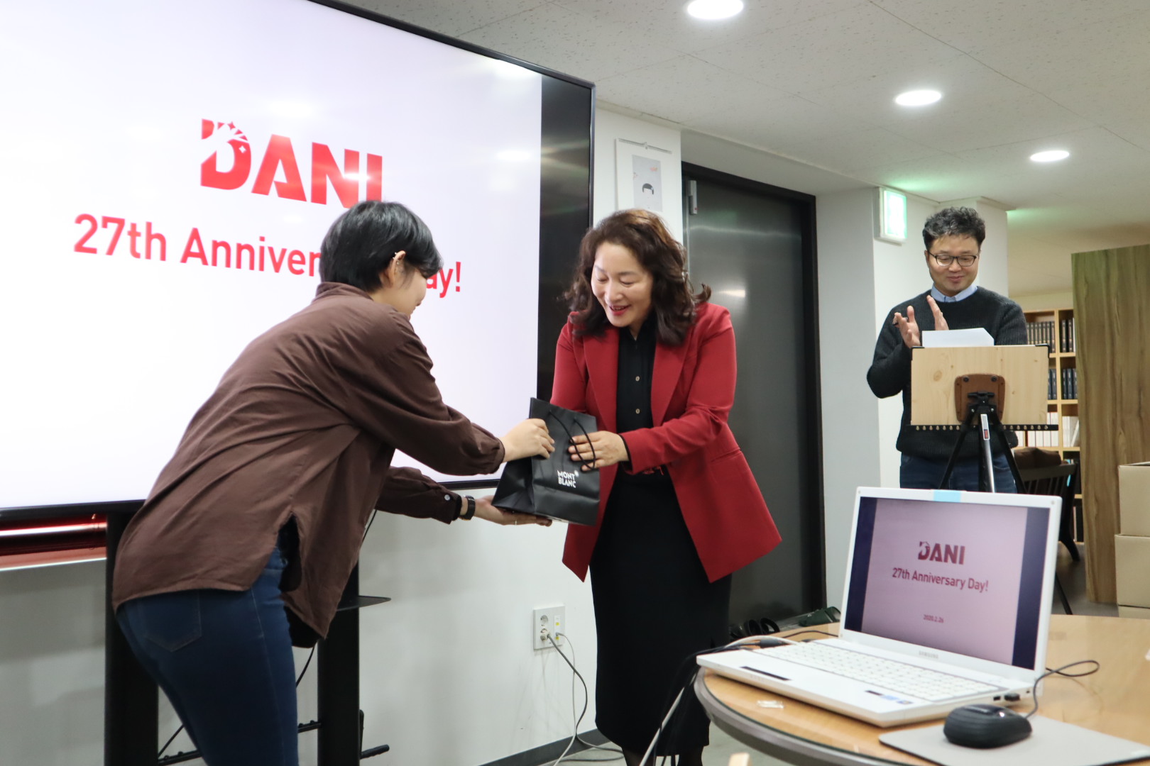 기념식에서 추기숙 대표이사는 “이제 어느 정도 자리 잡힌 새 둥지에서 두 번째로 창립기념식을 맞이하고 보니 해마다 새로운 목표를 수립하고 또, 그에 발맞춰온 다니 가족 여러분이 정말 고맙다. 함께 왔기에 여기에 다다른 것 같다.” 인사했고, 이에 화답이라도 하듯 직원 모두는 지난 27년간 다니기획의 리더로서 역사를 이끌어온 추기숙 대표이사를 위한 깜짝 선물을 증정했습니다.