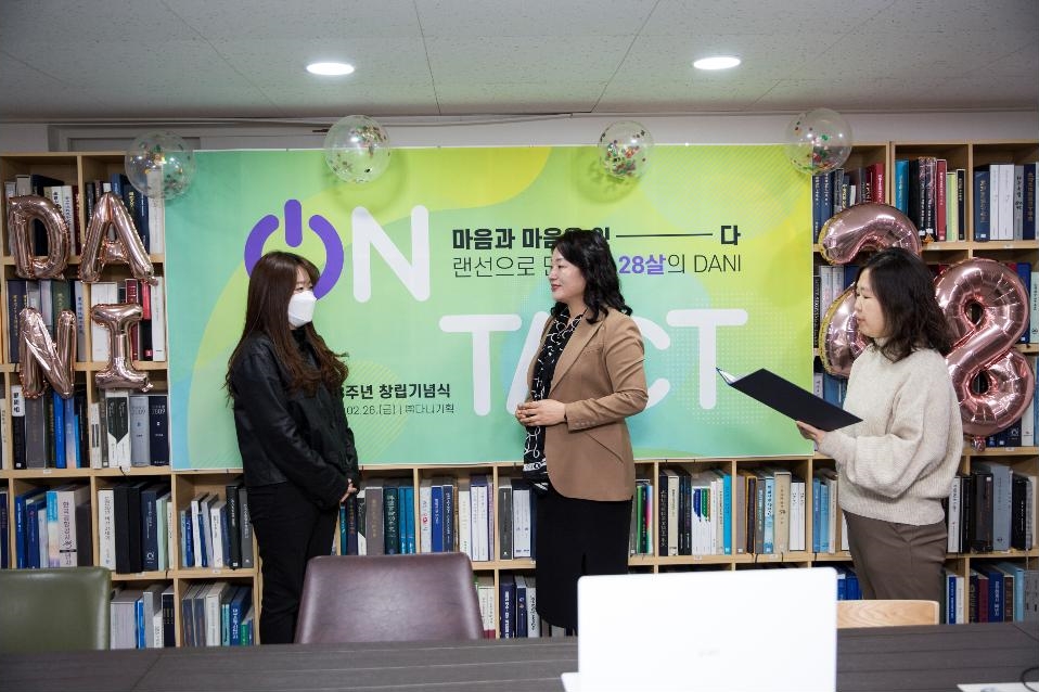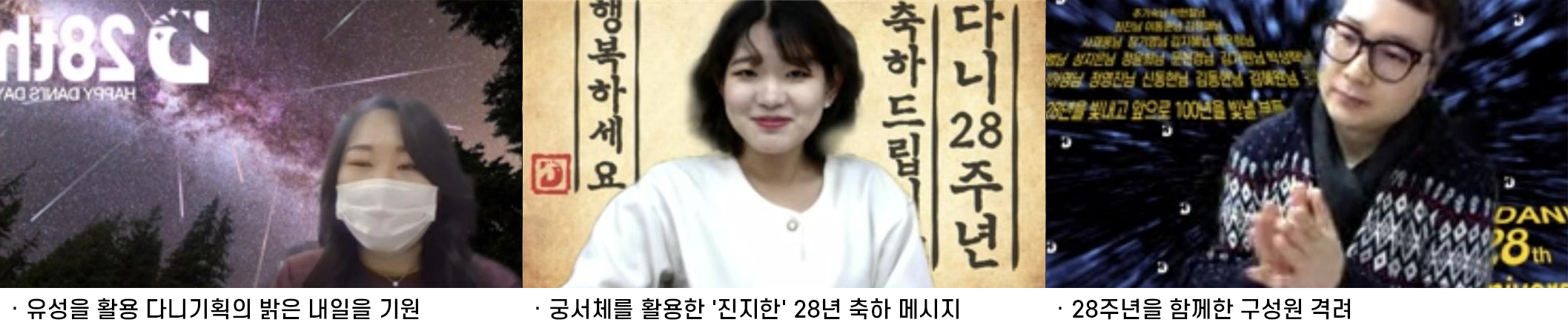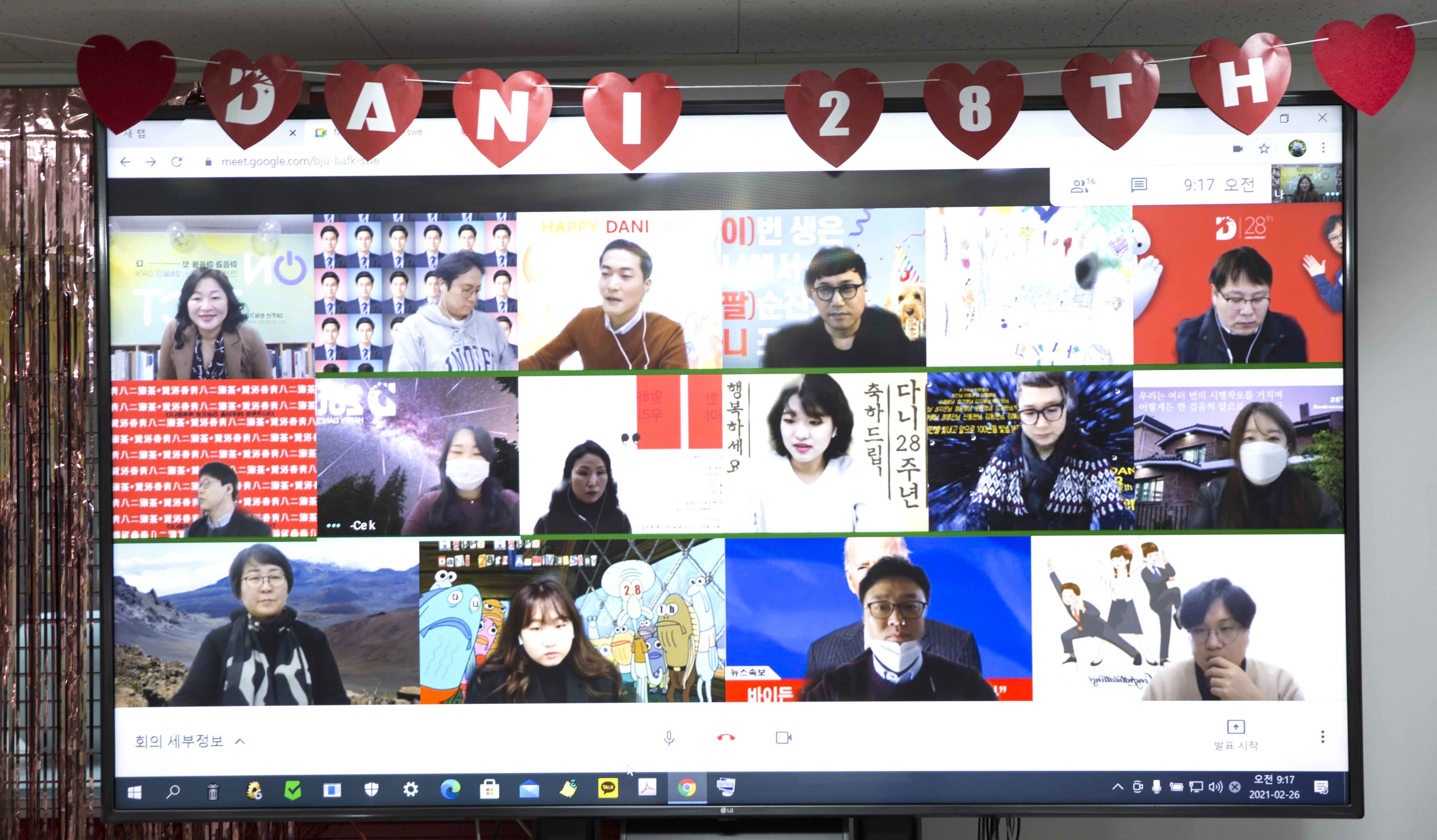 촬영을 끝으로 온·오프라인을 통해 진행된 ‘마음과 마음을 이은’ 다니기획 28주년 기념행사가 마무리되었습니다. 코로나19 확산에 따른 정부의 사회적 거리두기 지침에 따라 여러 차례 비대면 회의를 진행해왔던 만큼 큰 어려움 없이 On-Tact행사를 마칠 수 있었답니다.