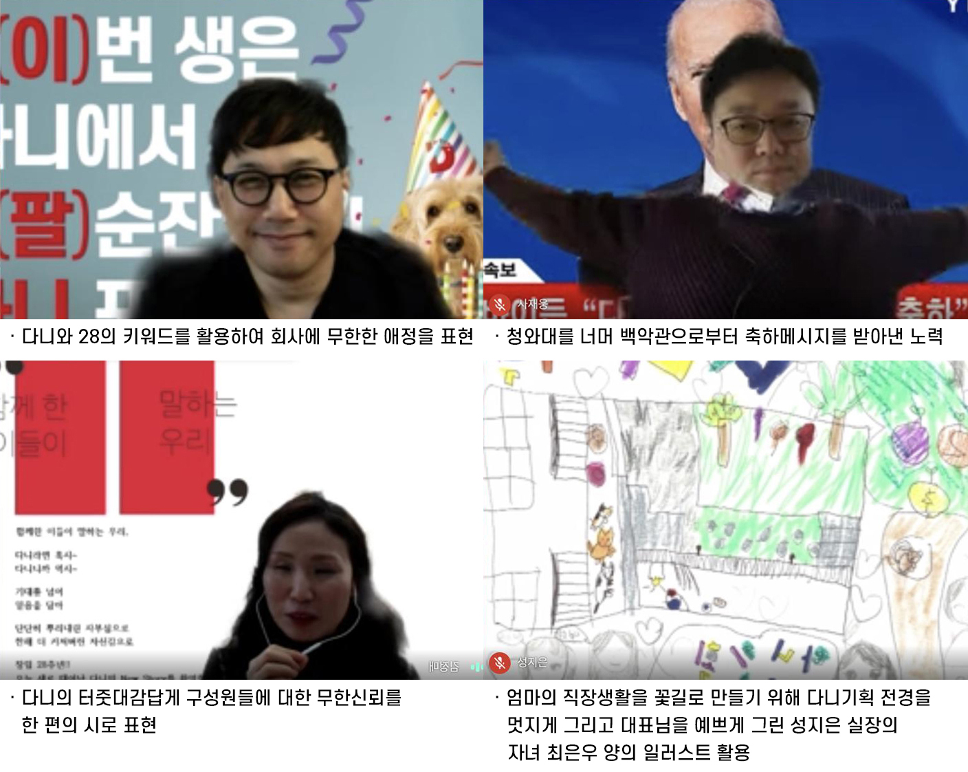 비대면 ‘온(On)택트’ 창립 행사로 몸은 멀어졌지만, 저희 다니기획은 해마다 거듭 발전하는 기획과 화기애애한 분위기 속에 마음만은 따뜻했던 ‘온(溫)택트’로 28주년을 기념했습니다. 따뜻한 마음으로 모인 직원들이 만들어갈 2021년 저희 다니기획의 행보를 기대해 주세요.