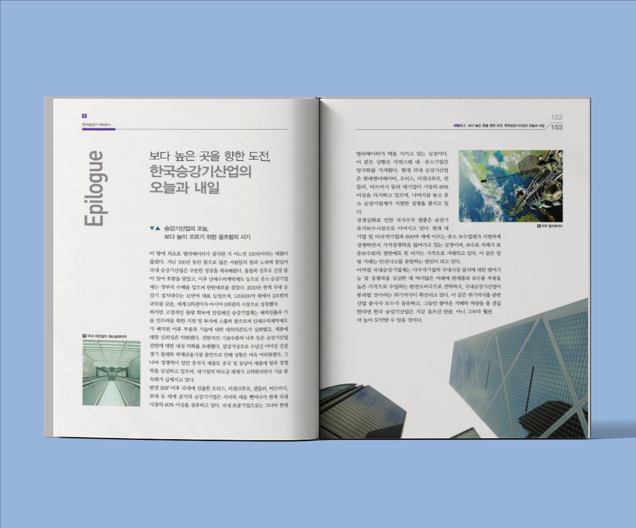 한국승강기 100년사는 프롤로그, 1~5장, 에필로그로 구성해 원시적인 개념의 승강 장치부터 현대의 승강기 안전관리제도까지 전반적인 변천사를 서술했다. 서두에 연혁 화보, 기획 화보, 현황 화보를 배치해 비주얼을 강화했고, 각 장 말미에는 당대 승강기인들의 회고록을 실어 읽는 재미를 더했다.