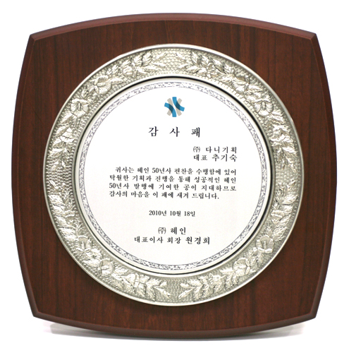 이와 같은 기획과 편찬 진행에 대한 노력으로 혜인의 원경희 회장님은 다니기획에게 그간의 노고를 치하하며 감사패를 전달해 주셨습니다.