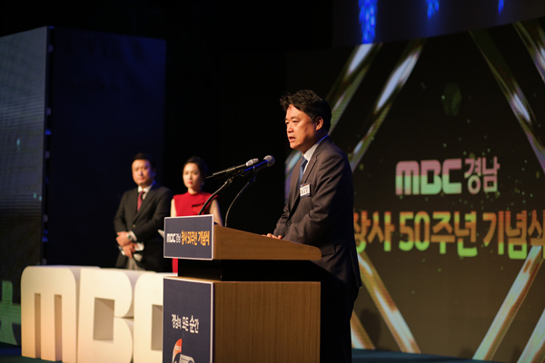 이날 사회를 맡은 개그맨 서경석, 김혜민 아나운서의 소개로, 정대균 사장님의 기념사가 이어졌습니다. 오늘의 MBC경남이 있기까지 고락을 함께하며 회사를 발전시켜온 모든 임직원에게 감사의 말씀을 전하고, 새로운 50년의 도약을 위해 당부 및 격려의 말씀으로 마무리가 되었습니다.