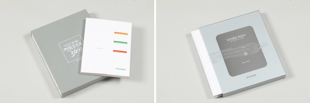 『코리아세븐 30년사』의 영문판은 마치 익숙하게 오가는 편의점처럼 보다 손쉽고 친숙하게 접근할 수 있도록 판형과 페이지를 줄여 무선으로 제작하였습니다. 『다인정공 30년사』 영문판은 한 번 가공된 금속이 쉽게 변형되지 않는 단단함을 책에 녹여내어 본책과 같은 크기의 양장으로 제작하였습니다.