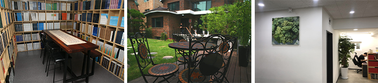 논현동에 위치한 신사옥은 총 3층의 주택으로 1층은 내·외부인이 사사를 자유롭게 볼 수 있는 북카페로, 2, 3층은 기획팀과 디자인팀의 업무공간으로, 4층은 직원들을 위한 휴식의 공간으로 자리를 잡았습니다. 무엇보다 신사옥 곳곳에 그림 액자와 조형물을 배치하여 갤러리 스타일의 모던 오피스를 완성하였습니다.