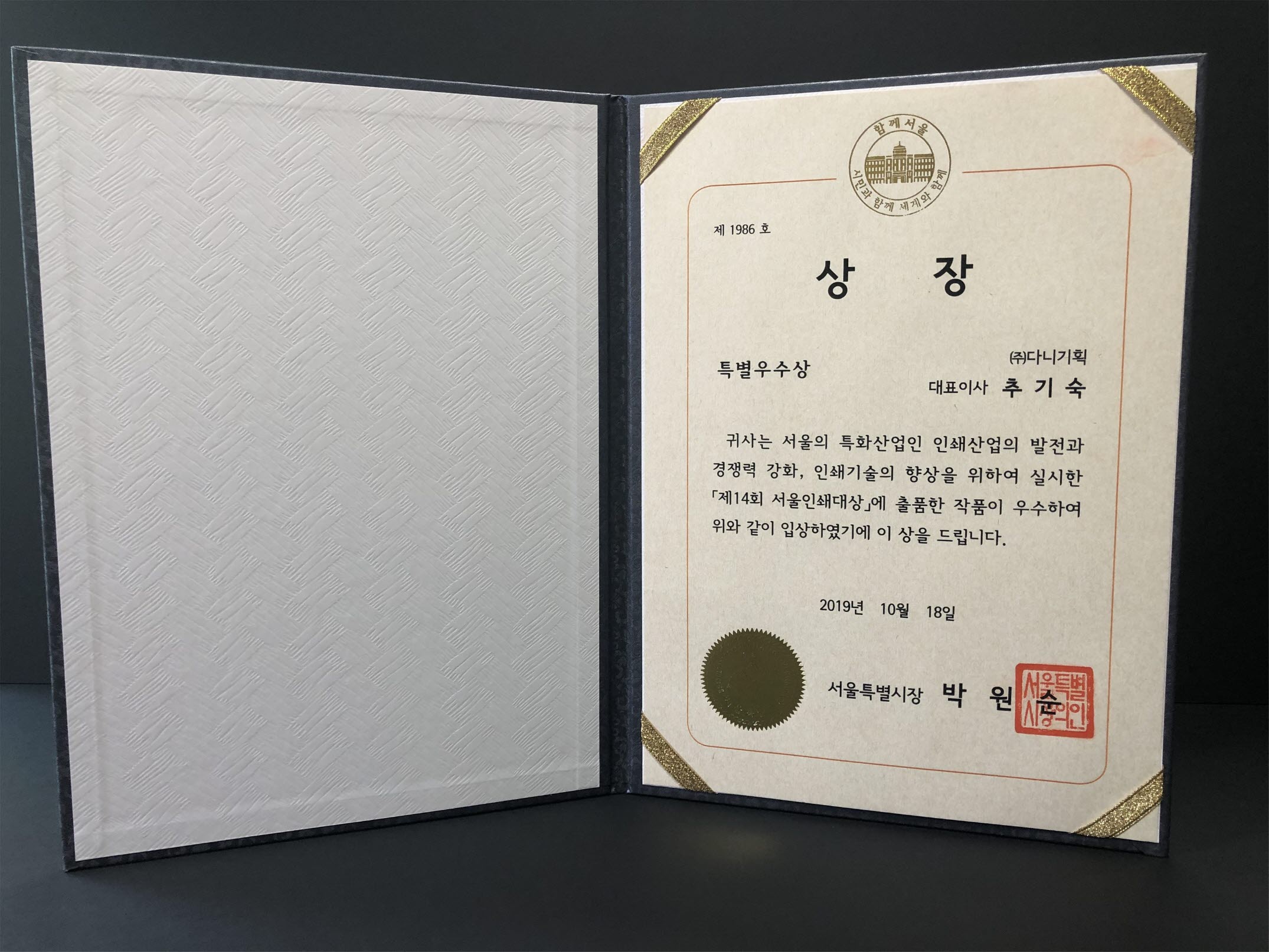 서울의 특화산업인 인쇄산업의 발전과 경쟁력 강화, 인쇄기술의 향상을 위하여 매년 실시되는 서울인쇄대상의 시상식은 지난 10월 18일 세종문화회관 세종홀에서 진행되었습니다.