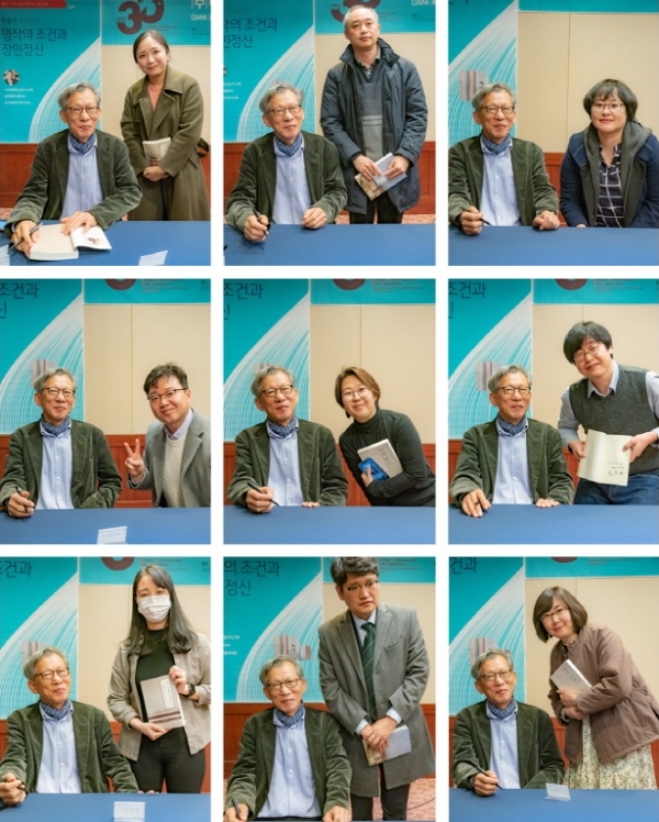 이후에는 유홍준 교수의 사인회가 이어졌습니다. 청년 시기부터 유홍준 교수의 책을 탐독하며 성장해온 다니기획의 구성원들은 각자 준비한 유홍준 교수의 저작 도서들을 들고 줄을 서서, 저마다 학업에 열중하던 호시절로 돌아간 듯한 기분을 만끽했습니다. 저자 사인회를 마친 뒤에는 단체 기념사진 촬영이 이어졌습니다.