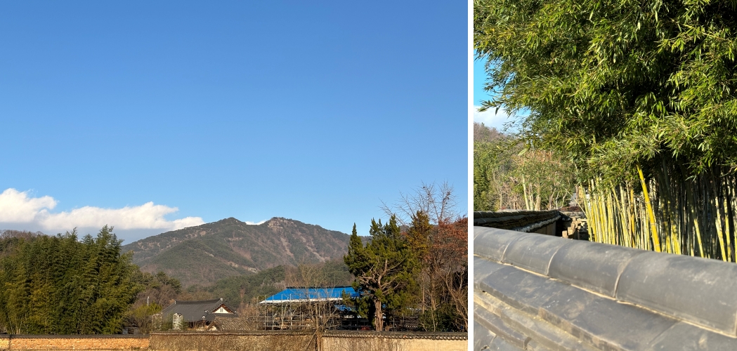 ▲연암 구인회의 생가가 자리한 승산마을과 방어산. 마을 곳곳에 대나무가 많다.
