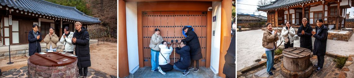 ▲호암 이병철 생가(왼쪽), 연암 구인회 생가(가운데), 만우 조홍제 생가(오른쪽)에서 부를 기원하는 다니기획 구성원