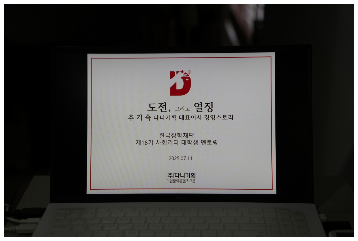 2025년 7월 11일 금요일, ‘사회리더 대학생 멘토링’ 제16기 멘티들이 다니기획을 방문했습니다. ‘사회리더 대학생 멘토링’은 대학생 멘티들이 사회 각 분야의 뛰어난 리더와 함께하며 꿈과 열정, 바른 품행과 리더십을 갖춘 인재로 성장하도록 지원하는 한국장학재단의 대표적 멘토링 프로그램입니다. 다니기획은 2023년부터 매년 조성식(전 포스코에너지 대표이사) 멘토님 및 이은경 부멘토님 팀과 함께 기업 탐방 프로그램을 연속적으로 진행하고 있습니다.