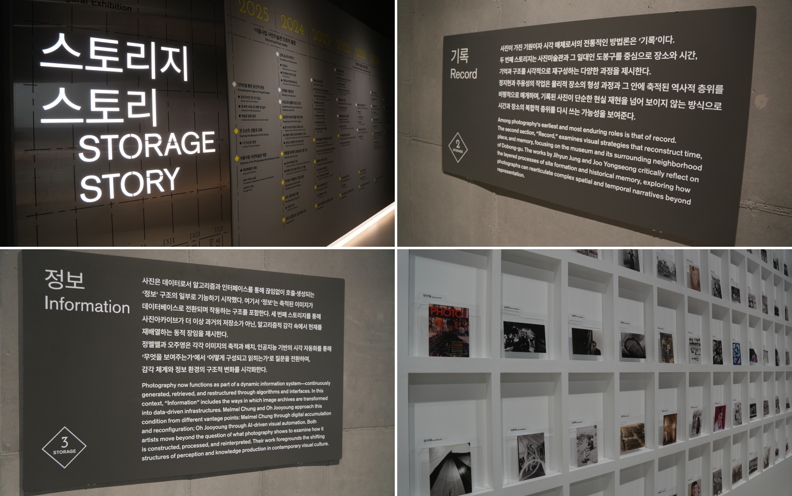 서울시립사진미술관에서는 ‘스토리지 스토리 Storage Story’와 ‘광채 光彩: 시작의 순간들’을 관람하였습니다. ‘스토리지 스토리’는 서울시립사진미술관이 지어지는 과정을 여섯 작가들의 각기 다른 시선과 감각으로 풀어낸 전시였습니다. 사진미술관의 첫 장을 여는 전시로서, 사진미술관의 형성을 하나의 이야기이자 살아있는 서사로 풀어냈습니다. ‘사진’이라는 매체가 개인과 사회의 기억을 매개하는 도구로서 어떤 지위에 있는지를 고민하게 만들었습니다.
