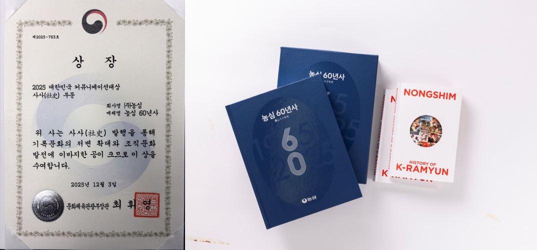 『농심 60년사』가 수상한 ‘문화체육관광부장관상’은 대한민국 커뮤니케이션대상에서 사사 부문에서 기업의 역사와 가치를 가장 탁월하게 기록한 작품에 수여하는 대상입니다. 수상작 『농심 60년사』는 '맛있는 인생'이라는 주제로 60년 역사를 담아내며, 라면 한 그릇에서 시작해 K-푸드의 세계화를 이끈 농심의 도전과 혁신 정신을 효과적으로 전달했습니다.