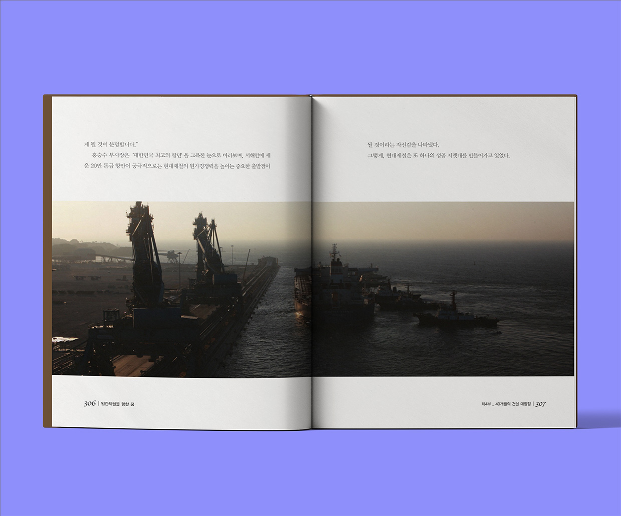 현대제철 일관제철소 스토리북은 일관제철소를 위한 준비와 건설과정을 관통하는 화두이자 에너지이며 최고의 전략으로 통한 ‘현대정신’을 담았다. 스토리가 있는 5개의 장으로 구성했으며, 제철소를 계획하고 가동하기까지의 과정을 실감나게 서술한 특별한 이야기책으로 만들었다.