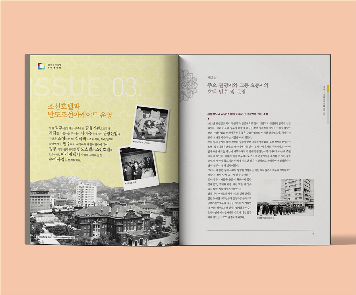 한국관광공사 50년사는 본책과 별책으로 편찬했다. 본책은 지난 역사를 한눈에 파악할 수 있는 공사의 50대 이슈를 선정해 수록한 것이 특징이고, 별책은 본책에서 다루지 못한 이야기를 스토리텔링 기법으로 집필해 가독성을 높였다. 100여 명의 전현직 임직원 인터뷰를 통해 역사 검증과 비하인드 스토리 발굴에 많은 노력을 기울였다.